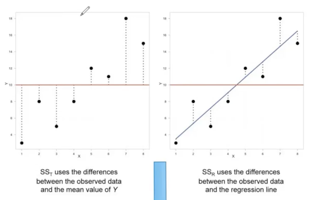 Sum Square Residual \(SS_R\) (right plot) is \(\sum(Y-\hat{Y})^2\) - difference between observed data \(Y\) and the regression line \(\hat{Y}\), or predicted data