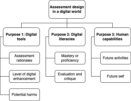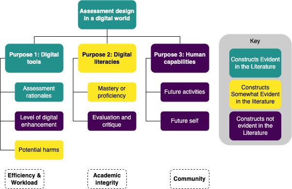 flowchart TD classDef purpose fill:#440154,color:#fff,stroke:#440154,stroke-width:4px classDef duty fill:#3B528B,color:#fff,stroke:#3B528B,stroke-width:4px classDef accept fill:#21918c,color:#fff,stroke:#21918c,stroke-width:4px classDef design fill:#5EC962,color:#000,stroke:#5EC962,stroke-width:4px A[Technology-Integrated Assessment] --- B(Assessment Purpose) A(Technology-Integrated Assessment) --- C(Duty of Care) A(Technology-Integrated Assessment) --- D(Technology Acceptance) A(Technology-Integrated Assessment) --- E(Assessment Design) B --- F([Assessment of Learning]) --- G([Assessment for Learning]) --- H([Assessment as Learning]) C --- I([Bias]) --- J([Inclusion]) --- K([Relationships]) --- L([Ethical EdTech]) D --- M([Performance Expectancy]) --- N([Effort Expectancy]) --- O([Social Influence]) --- P([Facilitating Conditions]) E --- Q([Measurement Theory]) --- R([Academic Integrity]) --- S([Relevance]) --- T([Reciprocity]) class B,F,G,H purpose class C,I,J,K,L duty class D,M,N,O,P accept class E,Q,R,S,T design