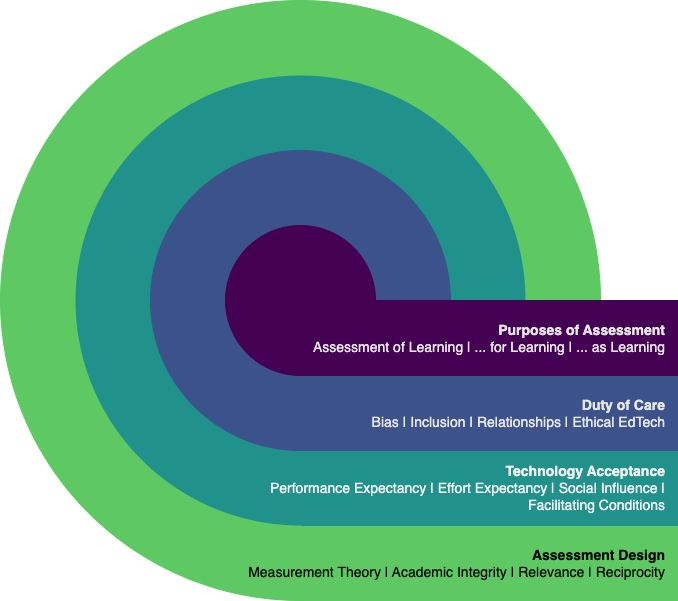 flowchart TD classDef purpose fill:#440154,color:#fff,stroke:#440154,stroke-width:4px classDef duty fill:#3B528B,color:#fff,stroke:#3B528B,stroke-width:4px classDef accept fill:#21918c,color:#fff,stroke:#21918c,stroke-width:4px classDef design fill:#5EC962,color:#000,stroke:#5EC962,stroke-width:4px A[Technology-Integrated Assessment] --- B(Assessment Purpose) A(Technology-Integrated Assessment) --- C(Duty of Care) A(Technology-Integrated Assessment) --- D(Technology Acceptance) A(Technology-Integrated Assessment) --- E(Assessment Design) B --- F([Assessment of Learning]) --- G([Assessment for Learning]) --- H([Assessment as Learning]) C --- I([Bias]) --- J([Inclusion]) --- K([Relationships]) --- L([Ethical EdTech]) D --- M([Performance Expectancy]) --- N([Effort Expectancy]) --- O([Social Influence]) --- P([Facilitating Conditions]) E --- Q([Measurement Theory]) --- R([Academic Integrity]) --- S([Relevance]) --- T([Reciprocity]) class B,F,G,H purpose class C,I,J,K,L duty class D,M,N,O,P accept class E,Q,R,S,T design